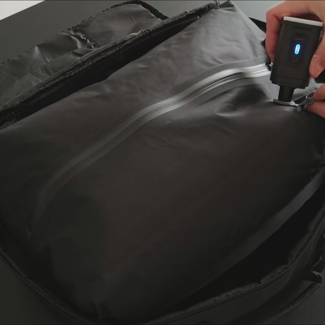 C’est très simple : rangez vos affaires dans le sac, retirez l’air à l’aide de la pompe sans fil et gagnez jusqu’à 60 % de place en quelques secondes.